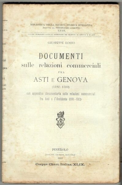 In 8°, pp. XXIII, (1), 302, (2). Brossura editoriale a stampa. Fioriture alla copertina, per il resto copia in ordine, interamente a fogli chiusi. Volume pubblicato sotto il patronato dei Municipi di Genova e di Asti. Biblioteca della Società Storica Subalpina LXII. Corpus Chart. Italiae, XLIX.