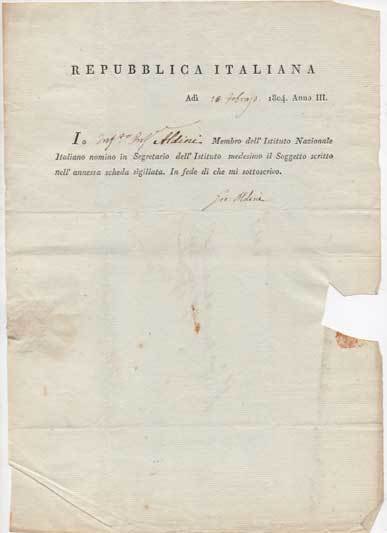 AUTOGRAFO 270x197 mm. 1 carta, stampata al recto, intestata "Repubblica Italiana", ripiegata, con tracce di sigillo. Firma a inchiostro nero al recto. Al verso l'indirizzo del destinatario. Il documento recita: "Io Aldini Membro dell'Istituto Nazionale Italiano nomino in Segretario dell'Istituto medesimo il Soggetto scritto nell'annessa scheda sigillata. In fede di che mi sottoscrivo […]". Aldini fu fisico e nipote di Luigi Galvani. L'Istituto Nazionale della Repubblica Italiana nacque nel 1802 a Bologna; era finanziato dallo Stato e vi collaborarono scienziati, storici, letterati e artisti. L'Istituto Nazionale rappresentava, inoltre, l'organo di consulenza per l'assegnazione delle cattedre universitarie.