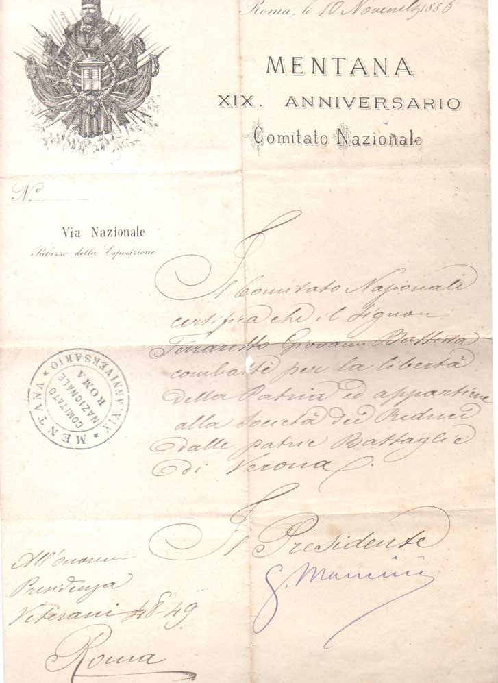 AUTOGRAFO315x215 mm. 1 bifolio, scritta 1 pagina. Manoscritto a penna nera con firma a penna blu su carta intestata "Mentana / XIX Anniversario / Comitato Nazionale". Con timbro a inchiostro del Comitato. Certificato sul quale si legge: "Il Comitato Nazionale certifica che il Signor Ferraretto Giovanni Bassina combatté per la libertà della Patria ed appartiene alla Società dei Reduci dalle Patrie Battaglie di Verona". La carta è firmata dal Presidente del Comitato, Mancini. La battaglia di Mentana del 3 novembre 1867 costituì i prodromi della breccia di Porta Pia per la conquista di Roma capitale d"Italia.