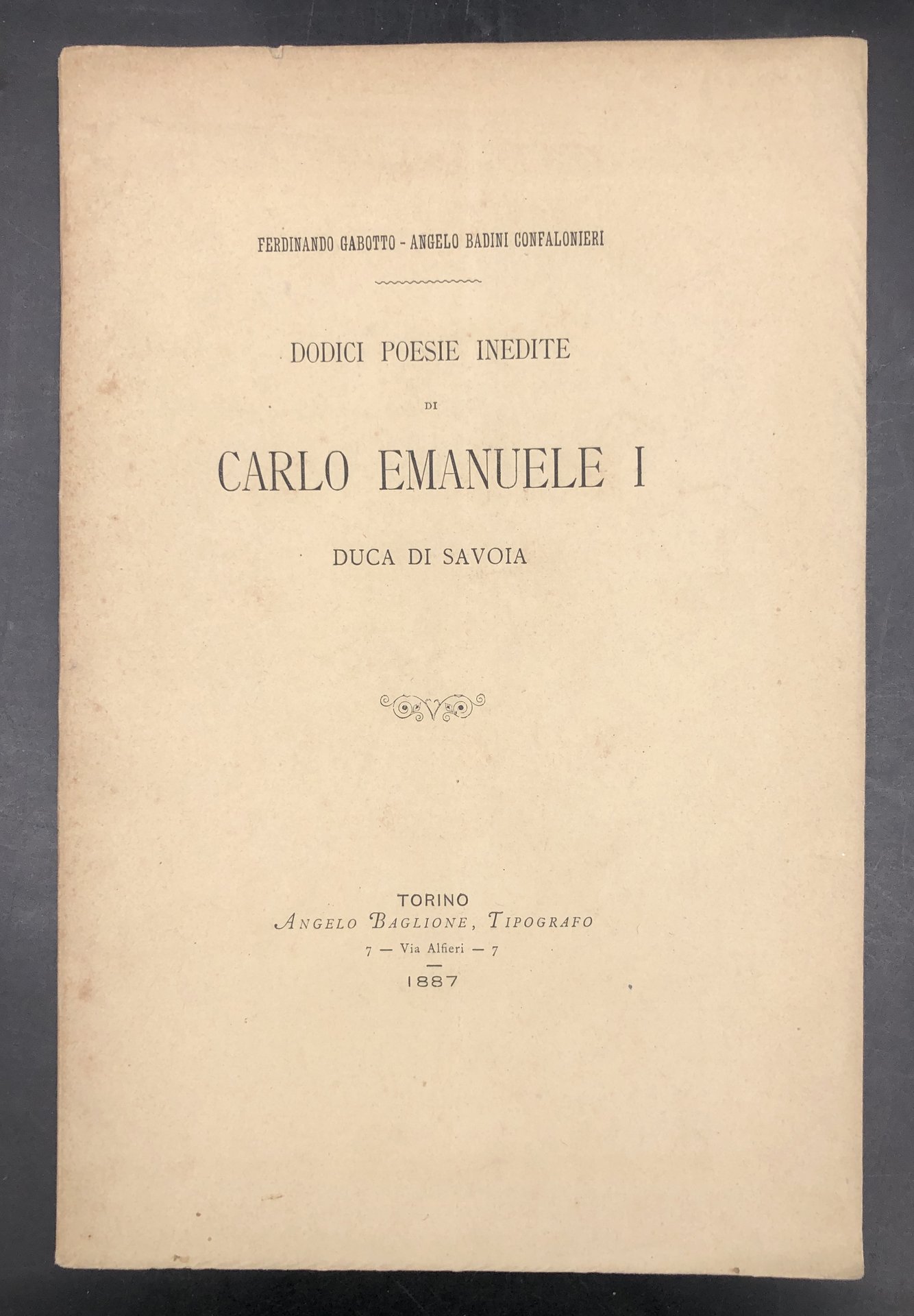 Dodici POESIE INEDITE di CARLO EMANUELE I Duca di SAVOIA. (Nell'occhiello Illustri NOZZE Rodolfo Renier ed Anna Campostrini, 19 settembre 1887). DEIDICA apenna dell'Autore.