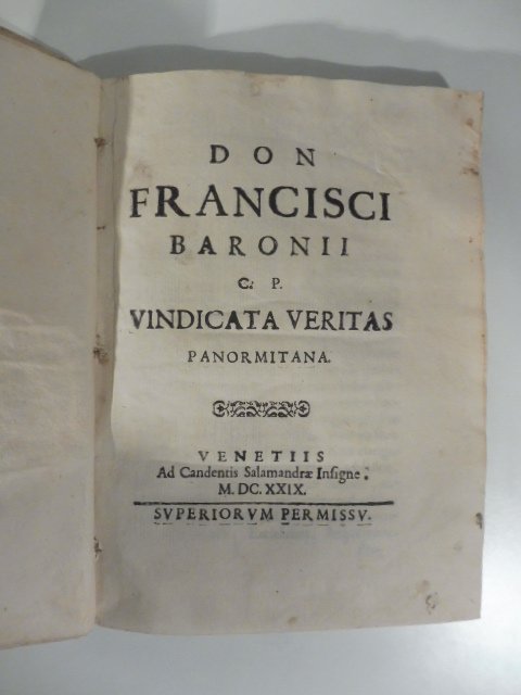 In 16 (cm 14,5 x 20,5), pp. (26) + (2b) + 196 + (1) di errata + (1b). Legatura coeva in piena pergamena morbida. Edizione originale molto rara di quest'opera di Manfredi Francesco Baronio, nato a Monreale nel 1593. Entro' nella Compagnia di Gesu' ma nel 1625 chiese le dimissioni: le ragioni di questo provvedimento vennero indicate un secolo dopo dallo storico gesuita Aguilera, che parlo' di eccessiva intemperanza e litigiosita'. Baronio fu poi accusato di avere aderito alla rivolta della popolazione di Palermo del 1647, e venne pertanto prima incarcerato dall'Inquisizione, poi mandato in esilio a Pantelleria e a Gaeta dove mori' nel 1654. Quest'opera presenta una rovente invettiva contro il gesuita Melchior Inchofer, che, nel difendere l'autenticita' della Sacra Lettera della Madonna ai Messinesi, non aveva risparmiato gli attacchi a Palermo, asserendo la supremazia della citta' di Messina su Palermo. Baronio sostiene l'autenticita' della Sacra lettera venerata a Messina come autentica missiva della Vergine e attacca il gesuita ribadendo la supremazia palermitana. Mira, p. 85. Bell'esemplare.