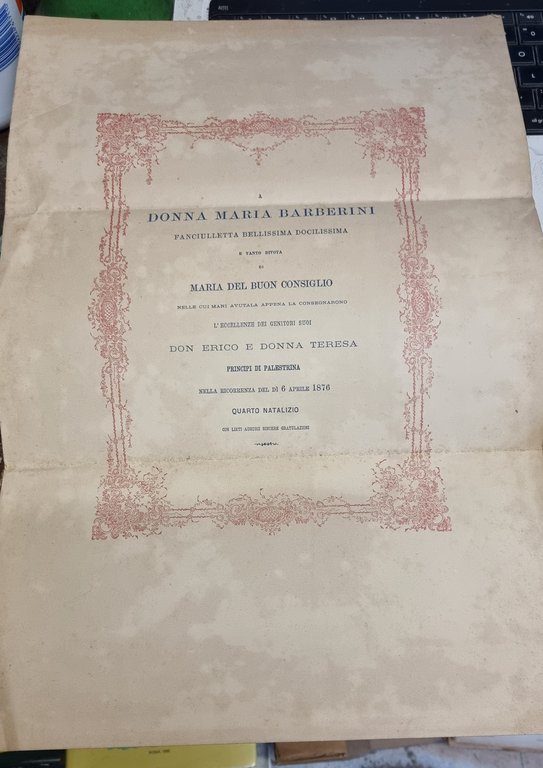 Donna Maria Berberini fanciulletta bellissima e dolcissima e tanto divota a Maria del Buon Consiglio, l'eccellenze dei genitori suoi don Enrio e donna Teresa principi di Palestrina nella ricorrenza del 6 aprile 1876 quarto natalizio con lieti auguti e sincere gratulazioni.
