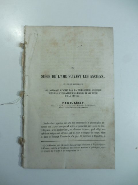 Du siege de l'ame suivant les anciens ou expose' historique des rapports etablis par la philosophie ancienne entre l'organisation de l'homme et les actes de la pensee