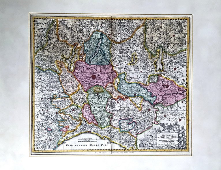 Grande carta raffigurante il Nord-Ovest dell'Italia Settentrionale con coloritura coeva eseguita da Mattheo Seutter, dim. del foglio con piccoli margini L. 59 x 51 cm. In buone condizioni incorniciata.