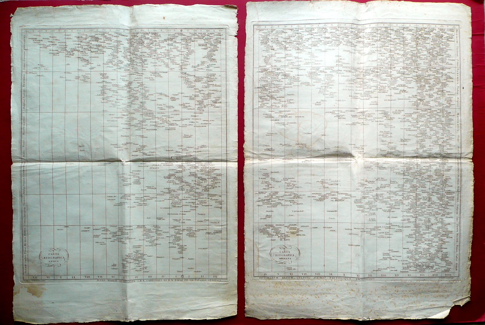 Due grandi incisioni, Carta Biografica Antica Carta Biografica Moderna Julio Mariae de Somalia S.R.E. Cardinali SS. D.N. Papae Pii VII Vicario Generali Optimarum Artium Cultori Eximio Fautorique Amplissimo 1797 J. Priestley inv. - R. Hondedei perfecit / F. Capellan sculp., Romae 1797; due grandi carte biografiche" incise in b/n su carta, speculari; ai margini esterni rispettivamente sinistro e destro indicazione delle categorie; ai margini superiori e inferiori linea del tempo e indicazione del secolo (vedi foto). Retri bianchi. Cm 76x55. Condizioni di conservazione Esemplari entrambi ben conservati con tracce d'uso, pieghe di conservazione, alcune piccole leggere bruniture; qualche lieve ombra di gora le quali non compromettono la lettura del testo. Margini e angoli con qualche strappetto, pieghetta e poche piccole mancanze, generalmente di piccole dimensioni. 19 dettagliati articoli che illustrano la convenzione per il collegamento telegrafico tra Massa (Ducato di Modena) e Sarzana (Regno di Sardegna). Indicate anche tasse e tariffe. EXTRA.0200 N "