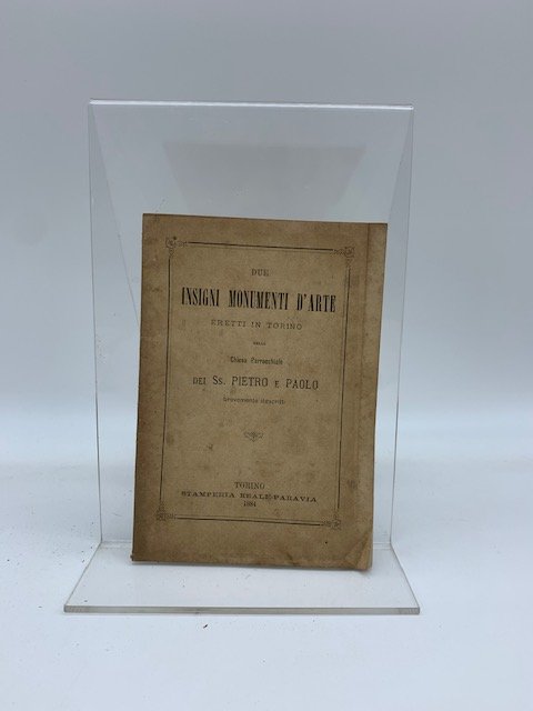 In 16 (cm 10,5 x 15,5), pp. 33 + (1) con tavola illustrata in xilografia all'antiporta raffigurante la facciata della Parrocchia dei Ss. Pietro e Paolo di Torino. Omaggio autografo alla prima carta bianca. Brossura editoriale. Argomenti: L'antica parrocchia di S. Salvario; Il rettore; Benefattori; Consacrazione della nuova Chiesa; Sua descrizione; Nuova icona; La caduta di Simon Mago; Autenticita' del fatto; Pittura del Gastaldi; Pregi d'arte; L'organo; Lo strumento; Il collaudo; ecc.
