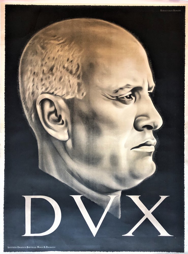 119x89 cm. Grande manifesto litografico di Benito Mussolini. Carta su carta telata. Seppia, bianco e nero. Ottime condizioni.