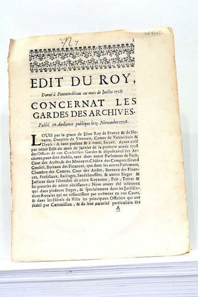 EDIT du Roy, donné à Fontainebleau au mois de Juillet 1708. Concernant les Gardes des Archives. Publié en Audiance publique le 15. Novembre 1708.