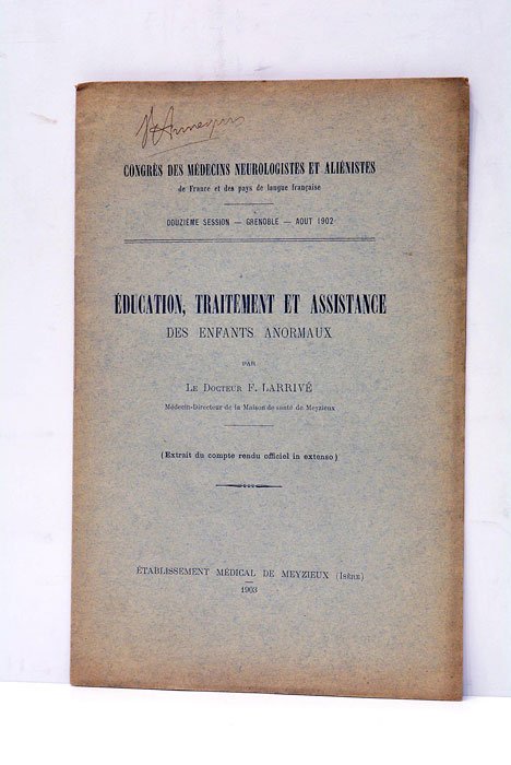 8 feuillets. (25x16 Cm). Broché. Couverture imprimée. Edition Originale. Petit opuscule sur les progrès apportés au soins donnés aux enfants anormaux. "Quelle que soit la gravité de leur état, qu'il s'agisse d'instables, de pervers, d'imbéciles ou d'idiots, ces enfants sont améliorables à divers degrés." Tiré-à-part du compte rendu officiel du congrès des médecins neurologistes et aliénistes.