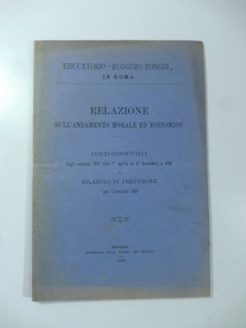 In 8 (cm 15 x 23), pp. 23 + (1b) con tabelle nel testo. Brossura editoriale. Relazione sull'andamento morale ed economico. Conti consuntivi degli esercizi 1897 e 1898 e bilancio di previsione per l'esercizio 1899 dell'educatorio Ruggero Bonghi in Roma.