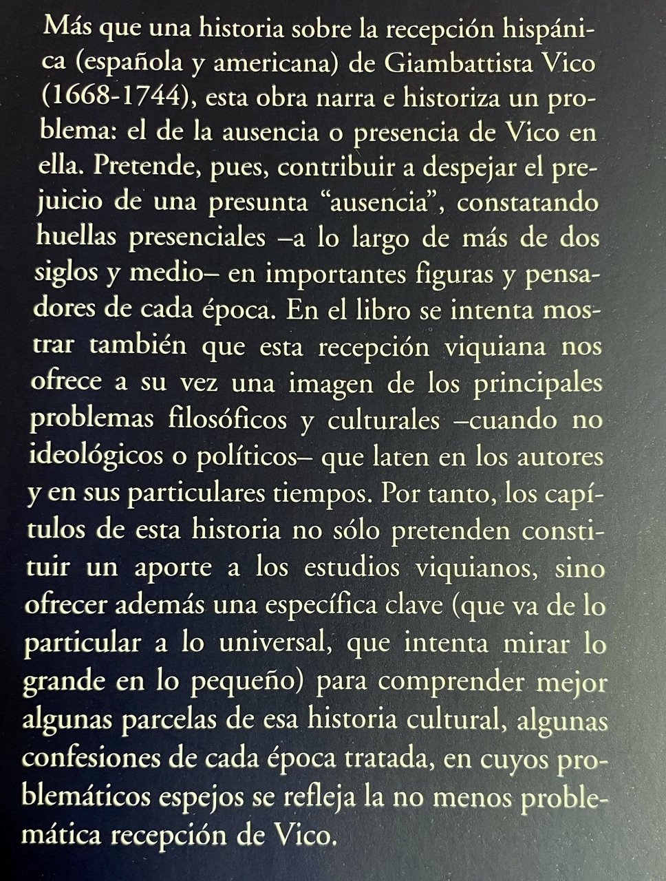 Más que una historia sobre la recepción hispánica (española y americana) de Giambattista Vico (1668-1744), esta obra narra e historiza un problema: el de la ausencia o presencia de Vico en ella. Pretende, pues, contribuir a despejar el prejuicio de una presunta ausencia, constatando huellas presenciales a lo largo de más de dos siglos y medio en importantes figuras y pensadores de cada época. En el libro se intenta mostrar también que esta recepción viquiana nos ofrece a su vez una imagen de los principales problemas filosóficos y culturales cuando no ideológicos o políticos, que laten en los autores y en sus particulares tiempos. Por tanto, los capítulos de esta historia no sólo pretenden constituir un aporte a los estudios viquianos, sino ofrecer además una específica clave (que va de lo particular a lo universal, que intenta mirar lo grande en lo pequeño) para comprender mejor algunas parcelas de esa historia cultural, algunas confesiones de cada época tratada, en cuyos problemáticos espejos se refleja la no menos problemática recepción de Vico.