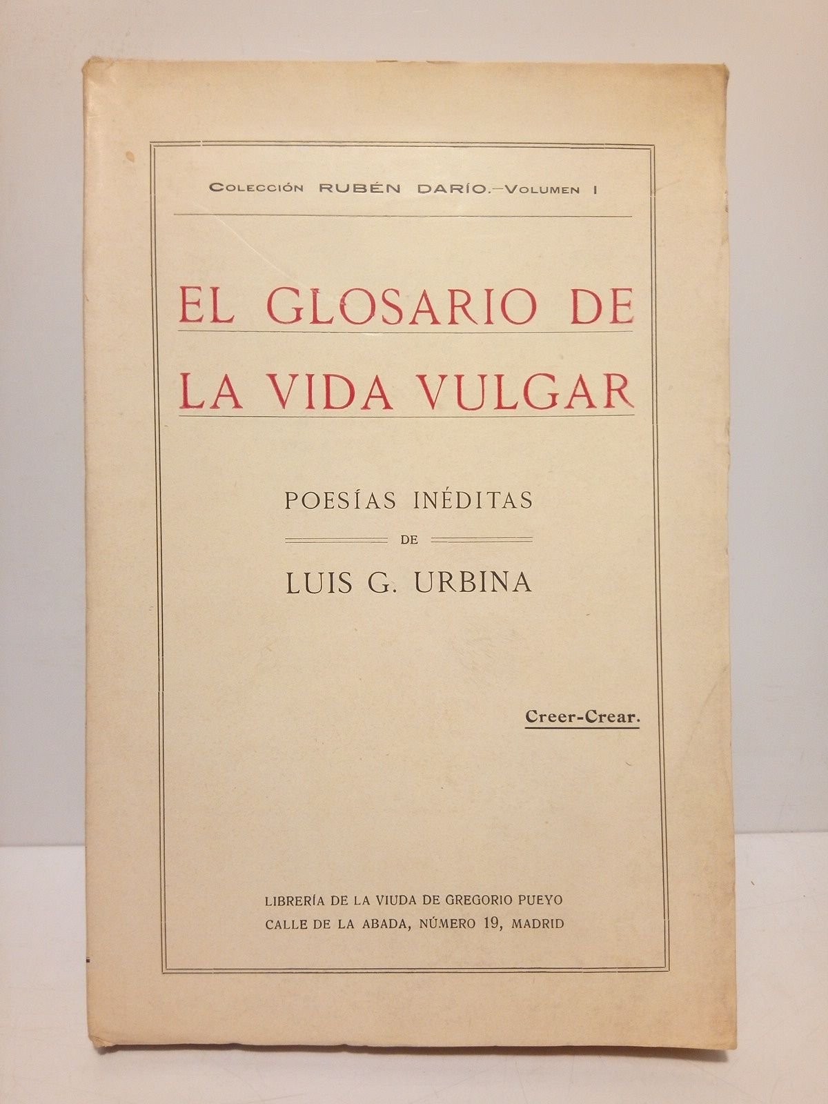 [PRIMERA EDICION].- Madrid: Librería de la Viuda de Gregorio Pueyo [en la cubierta], Imp. de M.García y Galo Sáez [en la portada], 1916.- 172 p., [1 h.]; 8º mayor (19,3 x 12,7 cm); Intonso, con todas sus barbas; Rústica Ed.- (Col. Rubén Darío. 1).* Excelente estado. Luis G. Urbina nació en Ciudad de México, 8 de febrero de 1864 y falleció en Madrid el 18 de noviembre de 1934. Gran escritor mejicano, sobresale entre los grandes poetas del país hermano por su calidad estética y madurez. Fue poeta de transición entre el romanticismo y el modernismo. LITERATURA, ESTUDIOS LITERARIOS, FILOSOFÍA Y PENSAMIENTO IBEROAMERICANO EN GENERAL