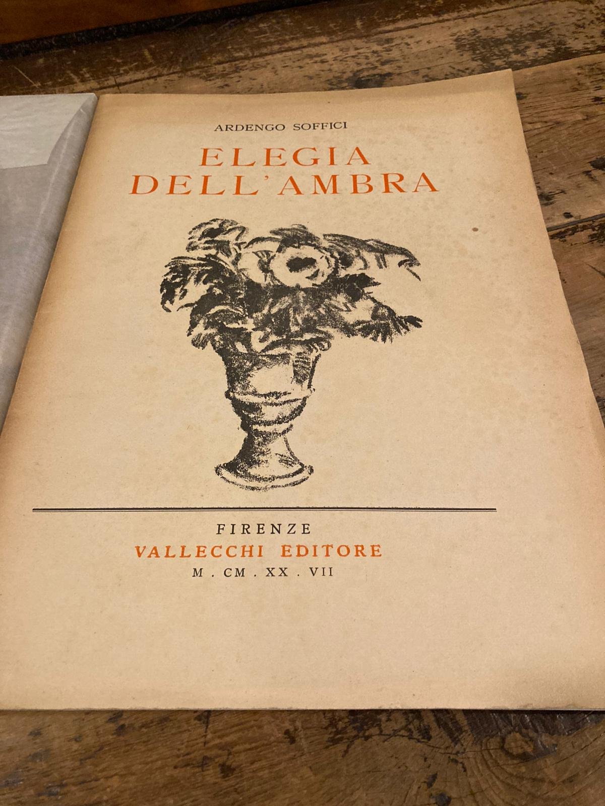 In-4° (355x260mm), pp (6), 8, (6), brossura originale con litografia di Ardengo Soffici. Ottimo esemplare, intonso, entro velina. Prima edizione, in grande formato, di sole 300 copie numerate con la firma autografa di Ardengo Soffici al colophon + 50 f.c. Con 4 litografie originali nel testo (compresa quella in copertina) di Ardengo Soffici. Lo stesso anno fu stampata una seconda edizione in 500 copie ma in formato più piccolo, in 4to). Jentsch, Libri d’artista, n. 551
