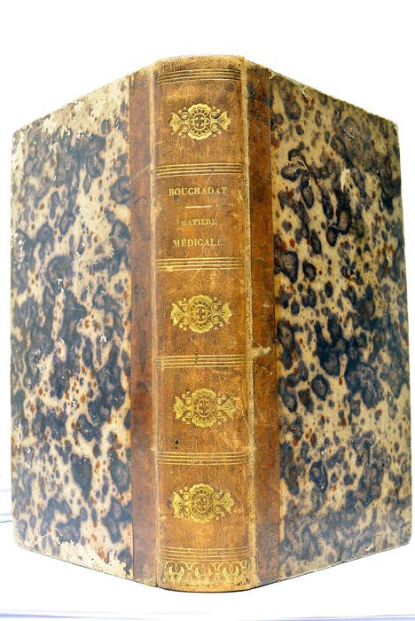 LI. 715 pages. 1 planche dépliante. (22x13 Cm). Demi-veau. Dos lisse orné (reliure de l'époque). Coins et coiffes émoussés. Quelques taches et rousseurs. Edition Originale de cet ouvrage du pharmacien bourguignon Apollinaire Bouchardat, qui a laissé d'importants travaux sur le diabète et la glycosurie, ainsi que des études sur le vin de sa région.