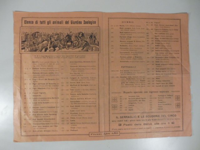 Bifolio cm 21 x 30, al recto bella immagine xilografica raffigurante l'interno di un circo con clown, elefanti ecc. Al verso l'elenco degli animali (elefanti, tigri, leoni, pappagalli, scimmie ecc.) presenti nel giardino zoologico del circo. Non e' dato sapere di che circo si tratti.