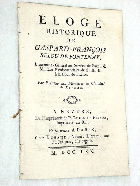Eloge historique de Gaspard-François Belou de Fontenay, Lieutenant-Général au Service de Saxe, et Ministre Plénipotentiaire de S.A.E. à la cour de France. Par l'auteur des Mémoires du Chevalier de Kilpar.