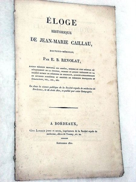in-8. 32pp. Broché, traces de reliure au dos. Feuillets légèrement écornés. Petites rousseurs. Rare impression de Bordeaux de cet éloge de l'ancien président de la Société Royale de Médecine de cette ville. Première édition.