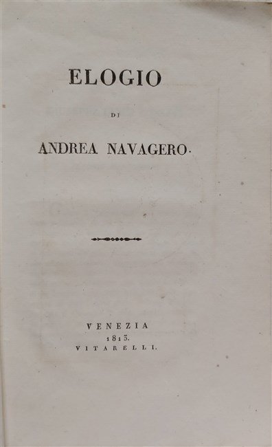in-8, pp. 60, leg. carta dec. coeva. Ritr. del Navagero inc. in antip. tratto da una antica medaglia. Pregevole “elogio” con molte notizie sul noto storiografo veneziano. Ottimo esempl. su carta forte. [152]