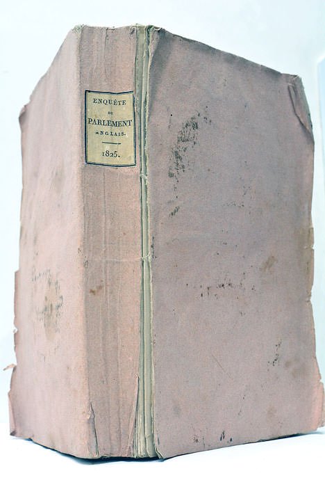 XIX. 359 pages. (21x13,5 Cm). Broché. Couverture de l'époque. Dos un peu fendillé. La première couverture et les trois premiers feuillets partiellement déreliés. Edition Française de cette importante enquête réalisée en Angleterre à la demande du Parlement. On y trouve la transcription des entretiens ("interrogatoires") des membres de la commission d'enquête avec diverses personnalités anglaises et françaises du secteur industriel. Le dernier entretien est celui du célèbre économiste Malthus qui donne son sentiment sur les lois relatives aux exportations, sur les mérites comparés de la main d'oeuvre française et anglaise, etc. Tache dans la marge extérieure du premier cahier. Bon exemplaire non rogné, à aprt quelques rousseurs et plis.