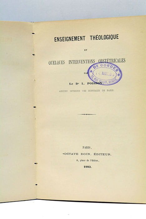 134 pages. (21x14 Cm9. Broché, couverture moderne, muette. Ouvrage de controverse sur l’avortement, contestant l’idée selon laquelle les textes sacrés en autorisaient la pratique dans les cas où il permettait de sauver la mère. L’auteur était apparemment favorable à son remplacement par l’opération césarienne qui, selon lui, préservait au mieux les vies de la mère et de l’enfant. Exemplaire portant le cachet du Dr. Cordes, à Genève, et copieusement annoté de commentaires critiques.