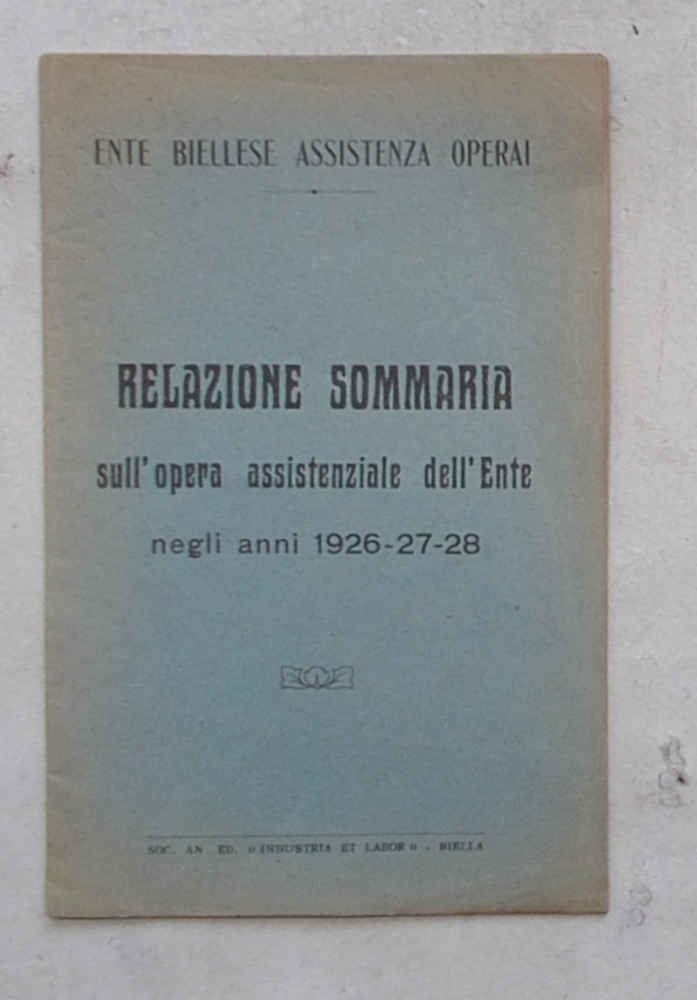 Ente Biellese Assistenza Operai. Relazione sommaria sull'opera assistenziale dell'Ente negli anni 1926-27-28.
