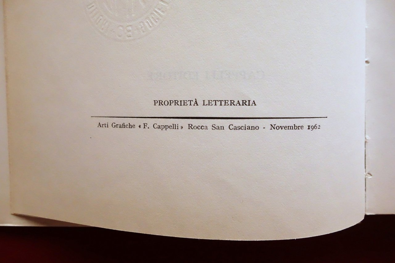 Rara prima edizione Cappelli (novembre 1962), corredata sia della sovraccoperta editoriale che di biglietto di accompagnamento per auguri.
