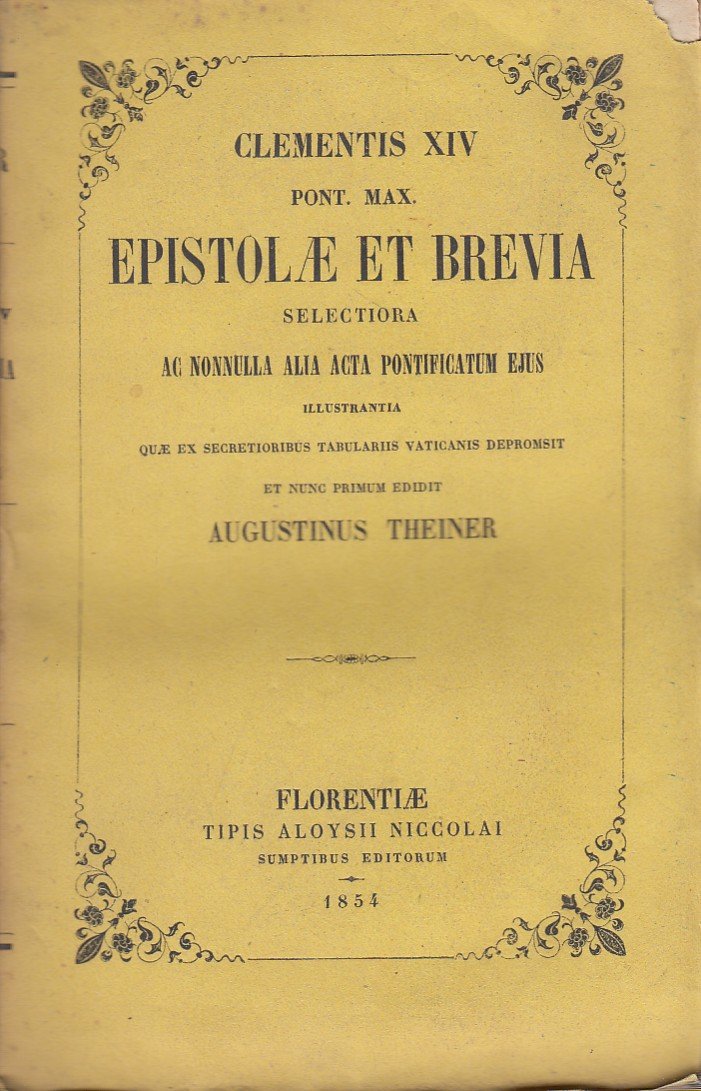 <p>In-16 (Cm 19 x 12,5), pp. 462, brossura editoriale. Testi in lingua latina, intonso. A cura di Augustinus Theiner (1804-1874), teologo e storico tedesco, ricercatore presso gli archivi vaticani. La pubblicazione contiene una serie di lettere e brevi scritti di Papa Clemente XIV insieme ad altri documenti relativi al suo pontificato. OTTIMO</p>
