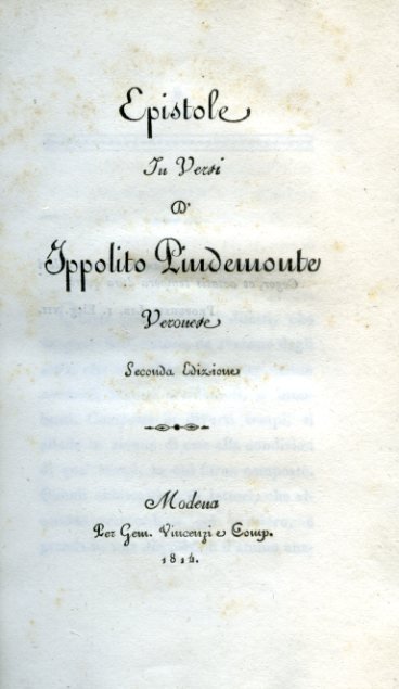 In-8°, pp. 129, bella brossura coeva marmorizzata in viola e in verde con tassello cartaceo al piatto. Leggere bruniture. Reimpressione modenese (con fittizia dicitura di seconda edizione al frontespizio) di queste epistole in versi pindemontiane, dedicate, di volta in volta, a Isabella Teotochi Albrizzi, Elisabetta Mosconi,Giacomo Vittorelli, Giovanni dal Pozzo, Aurelio Bertola, Paolina Gismondi, Alessandra Lubomirski, Scipione Maffei, Benedetto di Chateauneuf, Isotta Landi, Girolamo Fracastoro, nonché ad Apollo, a Omero e a Virgilio.