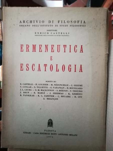 PRIMA EDIZIONE, Archivio di filosofia organo dell'istituto di studi filosofici edito in occasione di un Colloquio sulla teologia della storia, l'undicesimo della serie tenutosi dal 5 all'11 gennaio 1971 all'università di Roma Atti del convegno sulla problematica della demitizzazione e il tema Ermeneutica e Kiròs. Gli scritti sono in gran parte in lingua francese. L'ermeneutica e il kairos sono concetti interconnessi: l'ermeneutica è l'arte dell'interpretazione necessaria per identificare e agire nel tempo opportuno (kairos). In brossura. Pp. 293. Ottime condizioni.