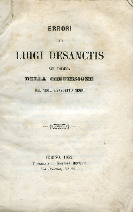 In-16°, pp. 17, (1), brossura decorata posteriore. In barbe fioriture. Edizione originale. Confutazione del 'Saggio dommatico-storico sulla Confessione' del Desanctis, definito 'accozzaglia di errori di protestanti' scritta 'con la mordacita' degli Apostati'. Dedicato all'arcivescovo di Vercelli, Alessandro Vincenzo Luigi D'Angennes. De Gubernatis, Diz. Biogr. d. scr. contemporanei, p. 753. Manca al Manno.