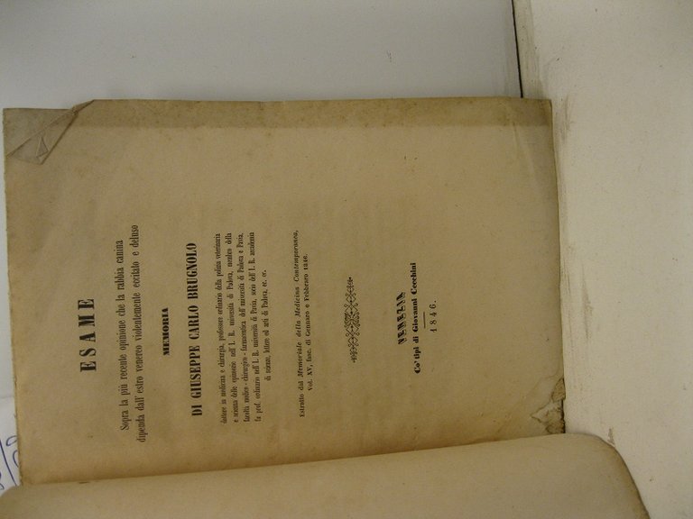 Esame sopra la piu' recente opinione che la rabbia canina dipenda dall'estro venereo violentemente eccitato e deluso. Estratto dal Memoriale della Medicina Contemporanea, vol. XV