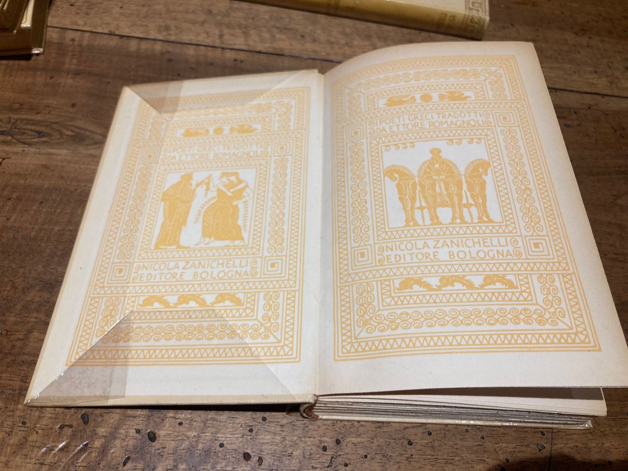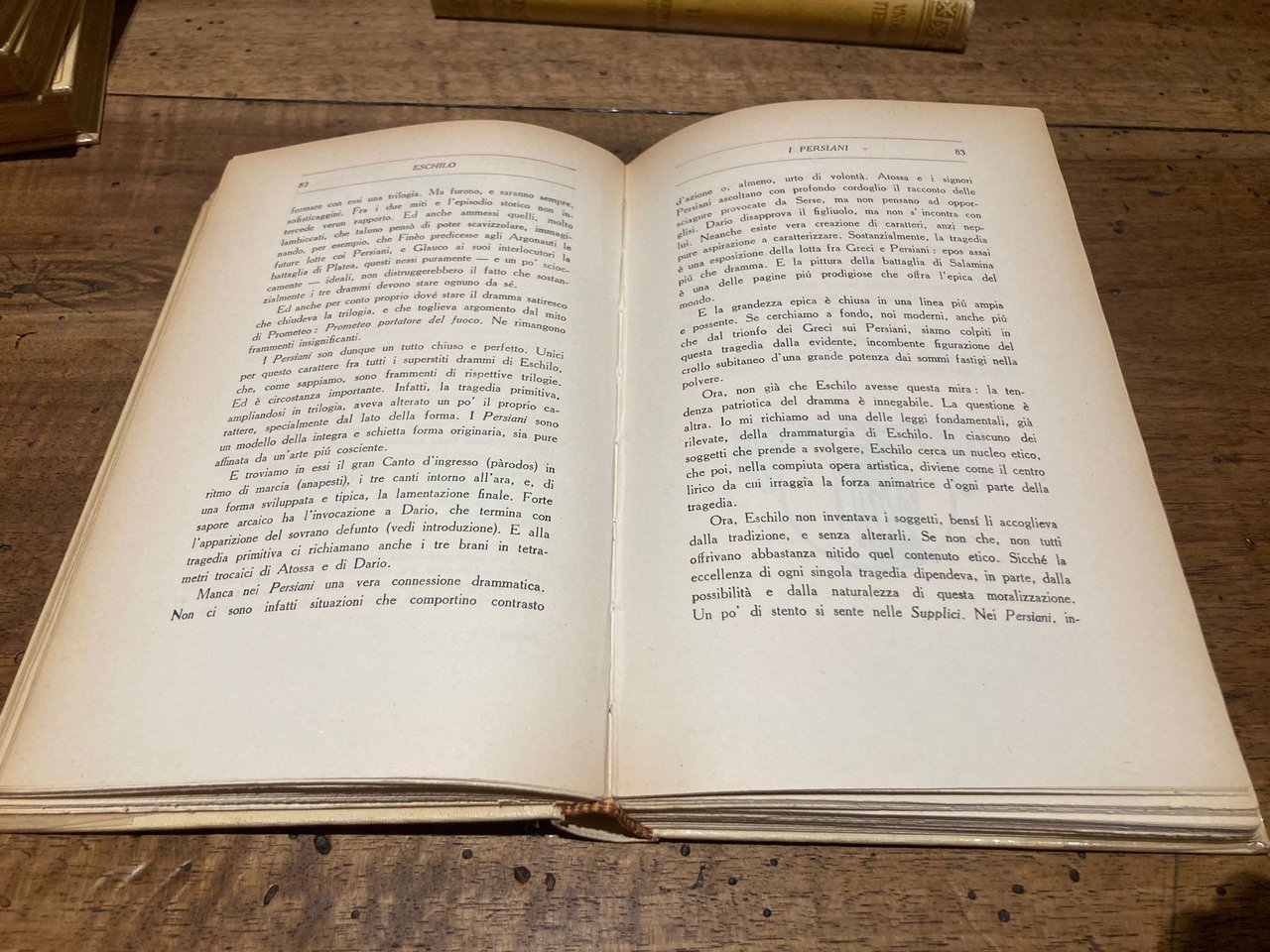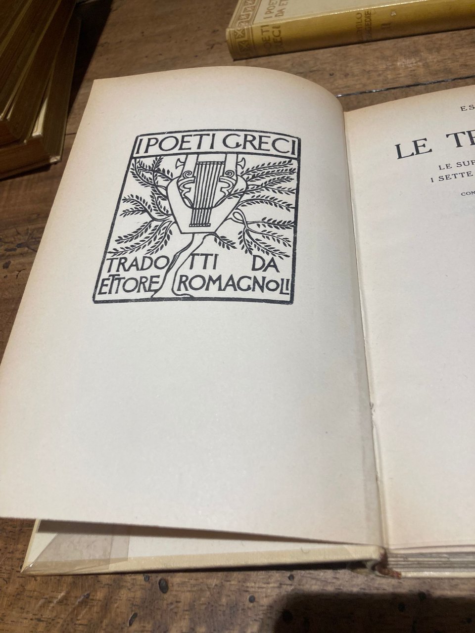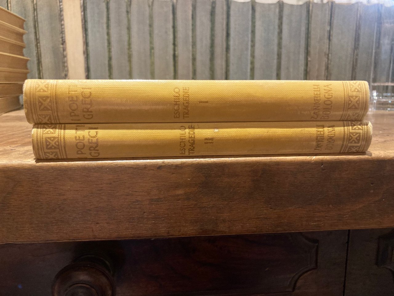 Due volumi in brossura, copertina rigida con incisioni di A.DE.CAROLIS. il libro è ricoperto da una protezione di plastica trasparente. Presenta numerose illustrazioni sia in antiporta che nel testo. Sono contenute nel PRIMO VOLUME: le Supplici, I Persiani , I 7 a Tebe , Prometeo. Nel SECONDO VOLUME sono presenti i testi: Le Coefore e Le Eumenidi. Zanichelli , Bologna, tradotti da Ettore Romagnoli. Primo volume n'313. Secondo volume n'80.