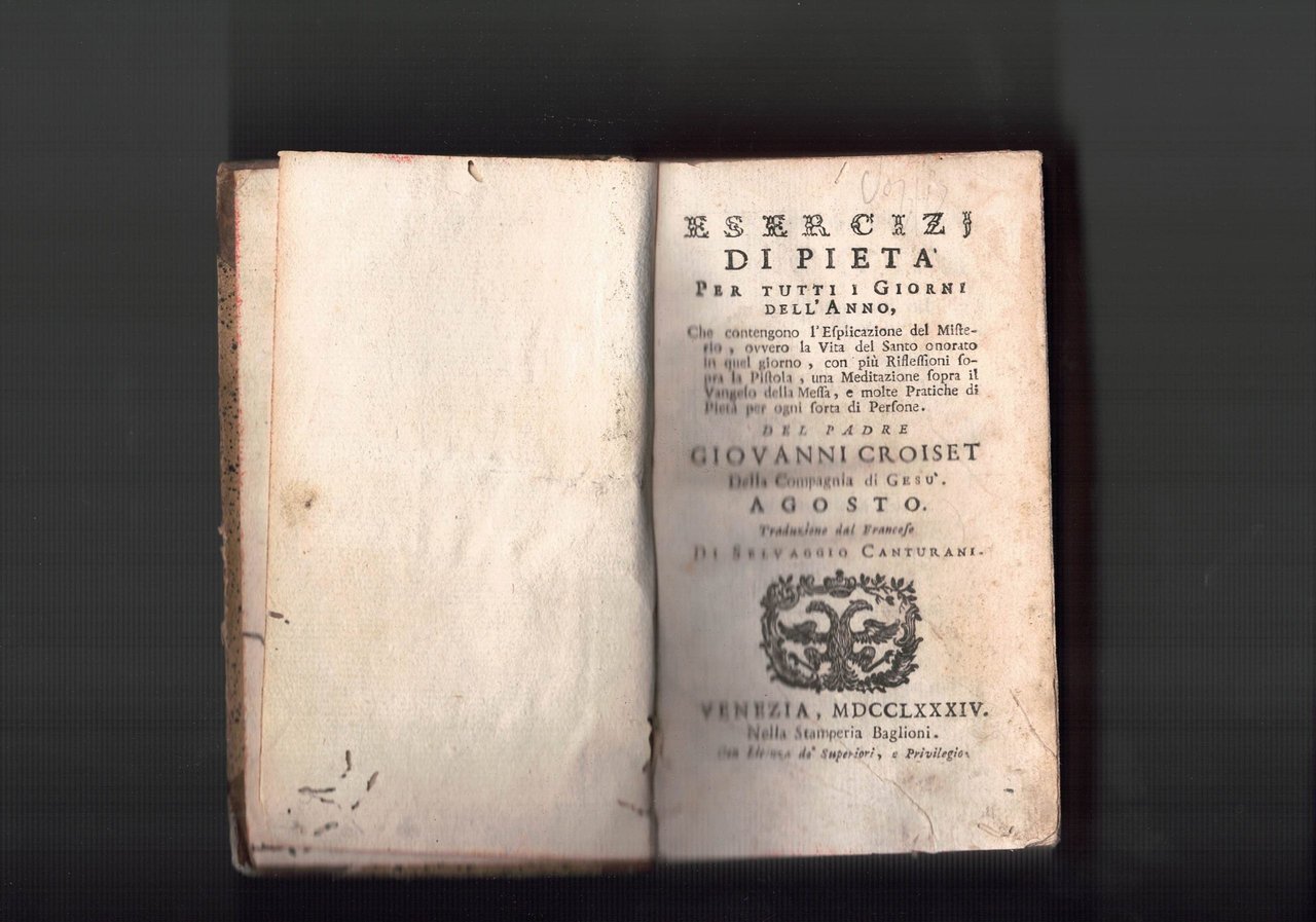 Esercizi di pietà per tutti i giorni dell'anno, che contengono l'esplicazione del Misterio ovvero la Vita del Santo onorato in quel giorno, con più riflessioni sopra la Pistola, una meditazione sopra il Vangelo della Messa e molte pratiche di Pietà per ogni sorta di persone. Agosto.