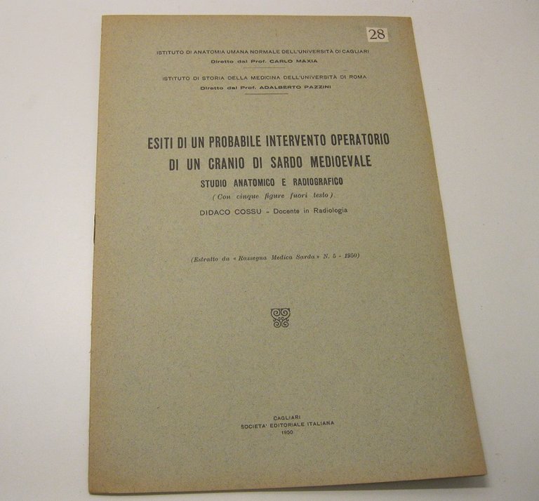 Esiti di un probabile intervento operatorio di un cranio di sardo medioevale. Studio anatomico e radiografico. (Con cinque figure fuori testo). (Estratto da 'Rassegna medica Sarda' N.5 - 1950) Ist. di anat. normale dell'Un. di Cagliari diretto dal prof. Maxia. Ist. di st. della medicina dell'Un. di Roma, diretto dal Prof. Pazzini
