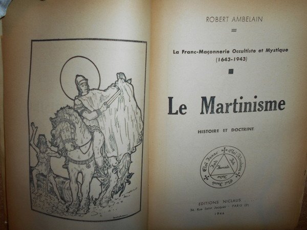 (Esoterismo) Robert, Ambelain. Paris, Editions Niclaus, 1946. Le Martinisme. Histoire et Doctrine. La Franc-Maçonnerie Occultiste et Mystique. In-8°, br. orig. con velina trasparente di protezione. 227, (2) pp. con alcune illustrazioni in bianco e nero nel testo. Segni d' uso e del tempo ma in buono stato di conservazione dell' edizione originale. Neg. scat. 2 opusc. nonn.