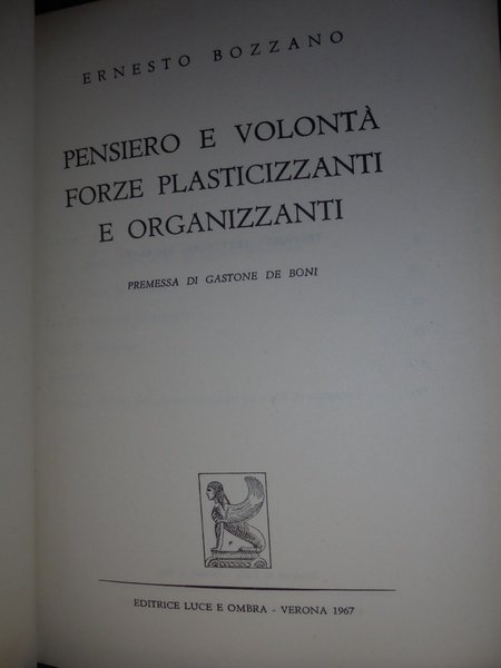 (Esoterismo) Ernesto, Bozzano. Verona, Editrice Luce e Ombra, 1967. Pensiero e volontà forze plasticizzanti e organizzanti. Premessa di Gastone De Boni. In-8°, tela con titolo in oro al dorso. 181 pp. In ottimo stato di conservazione. Uff. stanz. TV. esot.
