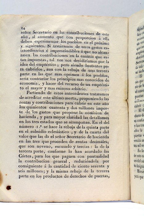 23 pages. 2 tableaux dépliants. (19,5x14 Cm). Broché. Couverture muette de l'époque. Plis. Petits accrocs et quelques taches. Intéressant mémoire économique présenté au gouvernement du Trienio Liberal par la Junta Nacional del Crédito Público, organisme institué par les députés libéraux de Cádiz pour améliorer les finances publiques et liquider la dette. 2 tableaux dépliants. Taches marginales. Rousseurs éparses.