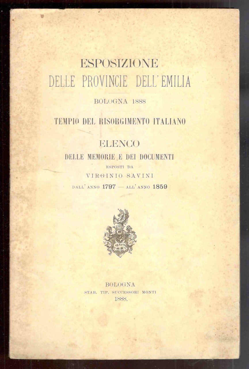 Esposizione delle provincie dell'Emilia. Bologna 1888 tempio del Risorgimento italiano. Elenco delle memorie e dei documenti esposti da Virginio Savini dall'anno 1797 all'anno 1859