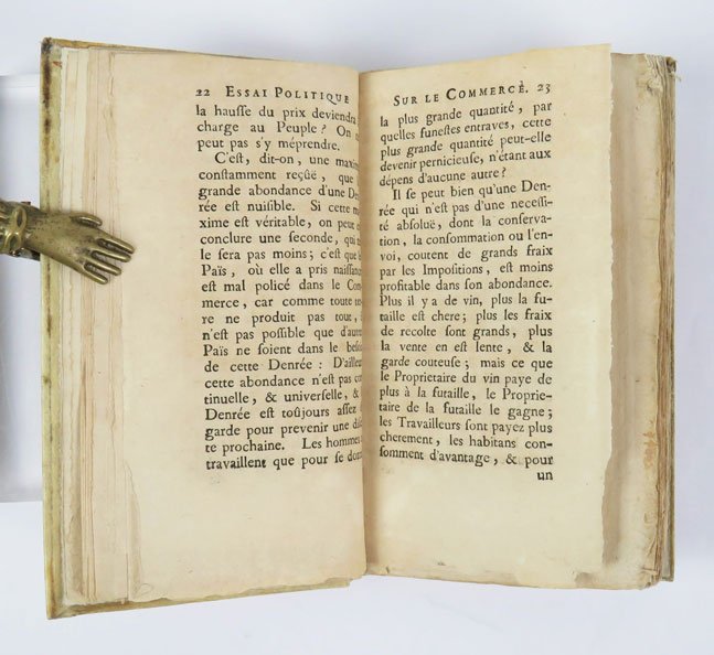 LIBRO Edizione originale. Esemplare in ottime condizioni (qualche pagina lievemente brunita per la qualità della carta), in barbe e con testimoni. Al piede del frontespizio una mano antica verga, in piccolo, il numero «179.». «A major work and a best-seller in the European economic Enlightenment, one of the earliest prospects of national economic competition to appear in France» («Books that made Europe», p. 124). -- Beccaria, Galiani, Adam Smith, Voltaire, Hume, Montesquieu: tutti lessero l’«Essai» di Melon e ne rimasero influenzati, a testimonianza dell’enorme impatto che l’opera ebbe sul pensiero economico del XVIII secolo. Pubblicato anonimo a Bordeaux o Rouen, il saggio ebbe una fortuna vastissima: venne ristampato nel 1734 e nel 1735, due edizioni videro la luce ad Amsterdam nel 1736, ampliate di sette capitoli, e in questa versione rivisitata fu nuovamente pubblicato nel 1742, 1754 e 1761. Numerosissime furono anche le traduzioni: in inglese (1738, 1739), in tedesco (1740), in spagnolo (1743), in svedese (1751), in italiano (1754, 1778, 1795), in danese e in russo (1759, 1768). -- Della prima edizione furono tirate due differenti emissioni, recanti lo stesso numero di pagine e l’identico errore di paginazione «231» in luogo di «131»; fu modificato solo il bifoglio di apertura, esterno al primo fascicolo: l’emissione qui presentata reca al frontespizio il titolo «Essai politique sur le commerce», mentre in quella censita da «Books that made Europe» si legge il più lungo «Essai politique sur le commerce, où l’on ébauche les principales matières qui en font l’objet [.] le Change & le Crédit Public»; sempre al frontespizio il fregio muta di forma; e ancora, alla carta 2* nella nostra emissione si legge la «Table des chapitres» seguita dall’«Errata», mentre nell’altra l’«Extrait d’une lettre de Paris au Libraire, le 15 Mars 1734». Sembra dunque da correggere, almeno parzialmente, «Books that made Europe» che parla di «two additional editions [.] alongside the first»: una seconda edizione datata 1734 è in effetti censita nei cataloghi online, ben individuabile dal diverso numero di pagine, 276 (si veda in particolare l’esemplare conservato alla BnF). Bibl.: Books that Made Europe, p. 124; Biblioteca Einaudi, n. 3820.