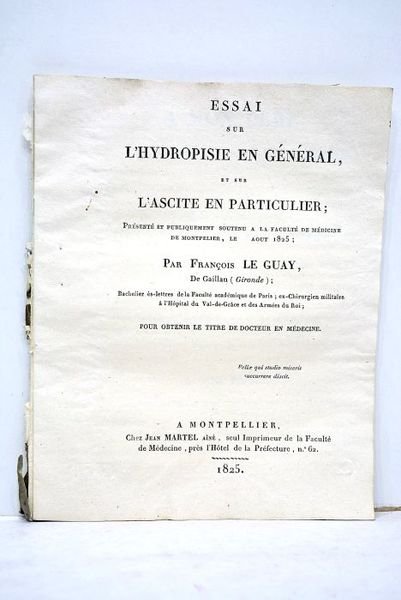 Essai sur l'hydropisie en général et sur l'ascite en particulier ; Présenté et publiquement soutenu à la Faculté de Médecine de, le août 1825.