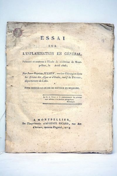 Essai sur l'inflammation en général. Présenté et soutenu à l'Ecole de Médecine de Montpellier, le avril 1806.
