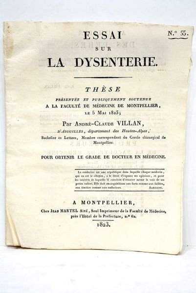 Essai sur la dysenterie. Thèse présentée et publiquement soutenu à la Faculté de Médecine de Montpellier, le 5 mai 1823.