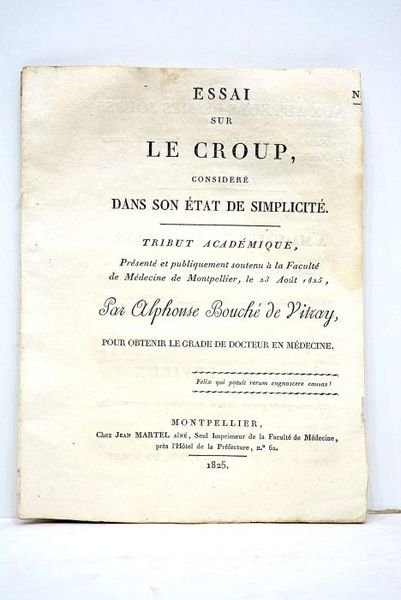 Essai sur le croup consideré dans son état de simplicité. Tribut académique présenté et publiquement soutenu à la Faculté de Médecine de Montpellier, le 23 août 1825.