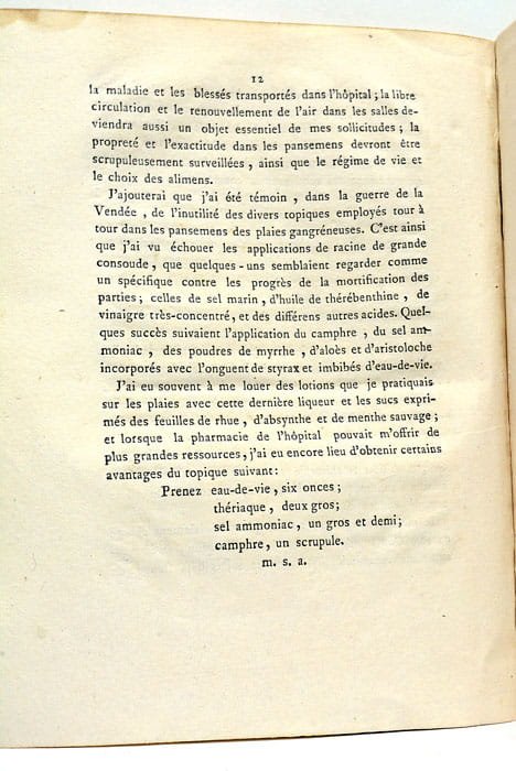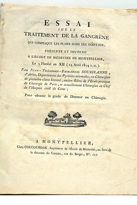 15 pages. (25x20 Cm). Broché. Dérelié. Essai par Mr. Soubiranne natif d'Arles et Chirurgien en Chef De l'Hospice civil de Ceret dans les Pyrénées Orientales. Il presente entre autre des lotions qu'il pratiquait sur les plaies avec les sucs exprimés des feuilles de rhue, d'absynthe et de menthe sauvage.