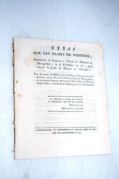 Essai sur les plaies de poitrine, présenté et soutenu à l'Ecole de Médecine de Montpellier.