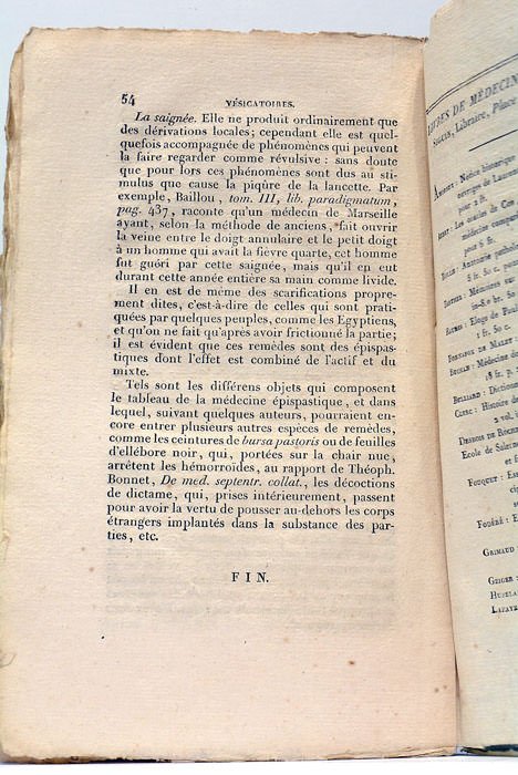 54 pages. 1 feuillet. (22x14 Cm). Broché. Couverture muette de l'époque. Etude sur les vésicatoires, ces substantes utilisées en pharmacie pour provoquer une révulsion locale et le soulèvement de l'épiderme. L'auteur prescrit notamment l'acupuncture pour y remédier. Papier un peu bruni. Bon exemplaire.