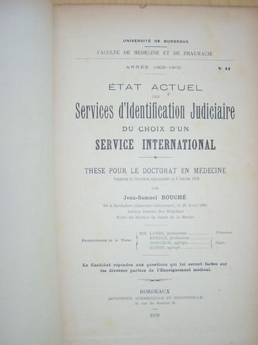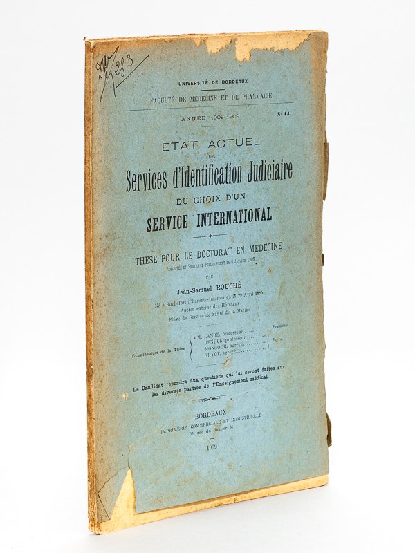 Thèse pour le doctorat en Médecine, présentée et soutenue publiquement le 6 janvier 1909, 1 vol. in-8 br., Imprimerie Commerciale et Industrielle, Bordeaux, 1909, 56 pp. Etat satisfaisant (couv. fort. frottée avec manques, bon état par ailleurs). Peu courant.