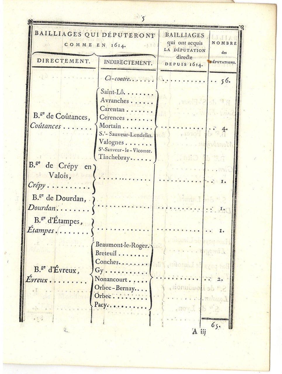 État, par ordre alphabétique, des bailliages royaux et des sénéchaussées royales des pays d'élections qui députeront directement ou indirectement aux Etats généraux; avec le nombre de leurs députations, chaque députation composée d'un Député du Clergé, d'un de la Noblesse et de deux du Tiers-état.