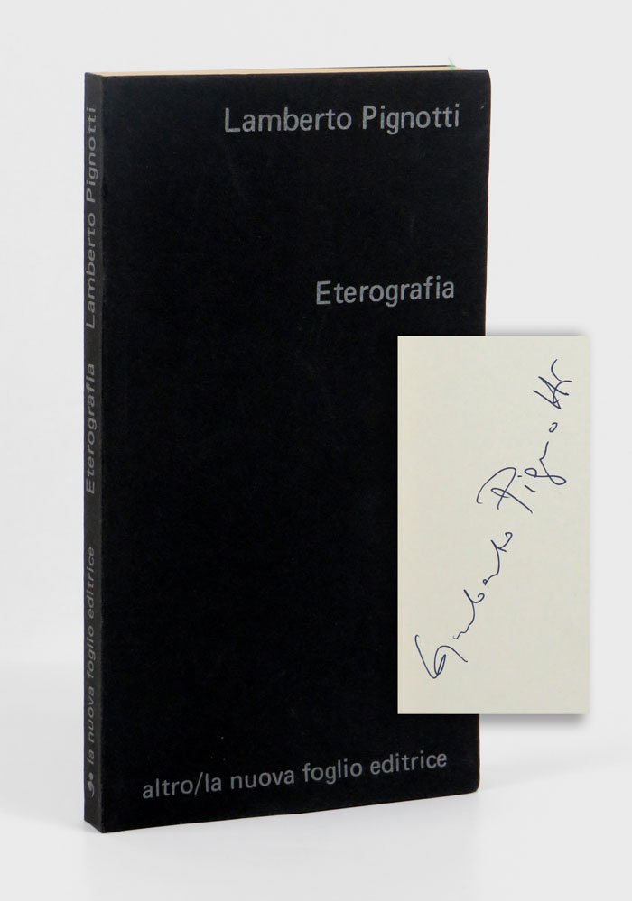 LIBRO Edizione originale. CON AUTOGRAFO. Ottimo esemplare pregiato dalla firma autografa dell’artista vergata in grande al frontespizio. Se l’eterografia è la proprietà di una lingua scritta data dalla mancata corrispondenza esatta tra simboli scritti e suoni del parlato, questo libro d’artista di Lamberto Pignotti - composto da numerose riproduzioni dei suoi famosi collage - riprende quella caratteristica facendola valere per l’effetto prodotto dalla mancata corrispondenza tra immagine e segni e parole sovrascritte dal poeta.