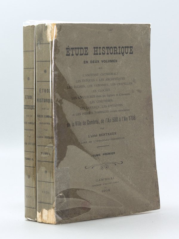 Rappel du titre complet : Etude historique en deux volumes sur l'ancienne cathédrale, les Evêques & les Archevêques, les Eglises, les Paroisses, les Chapelles, les Cloches, les Sépultures dans les Eglises et Couvents, les Cimetières, les Caveaux, les Epitaphes et les Pierres Tombales encore existantes de la Ville de Cambrai, de l'An 500 à l'An 1798 (2 Tomes - Complet) [ Edition originale ] Rare exemplaire bien complet de l'édition originale. Etat satisfaisant (manque en dos du tome premier, bon état par ailleurs).
